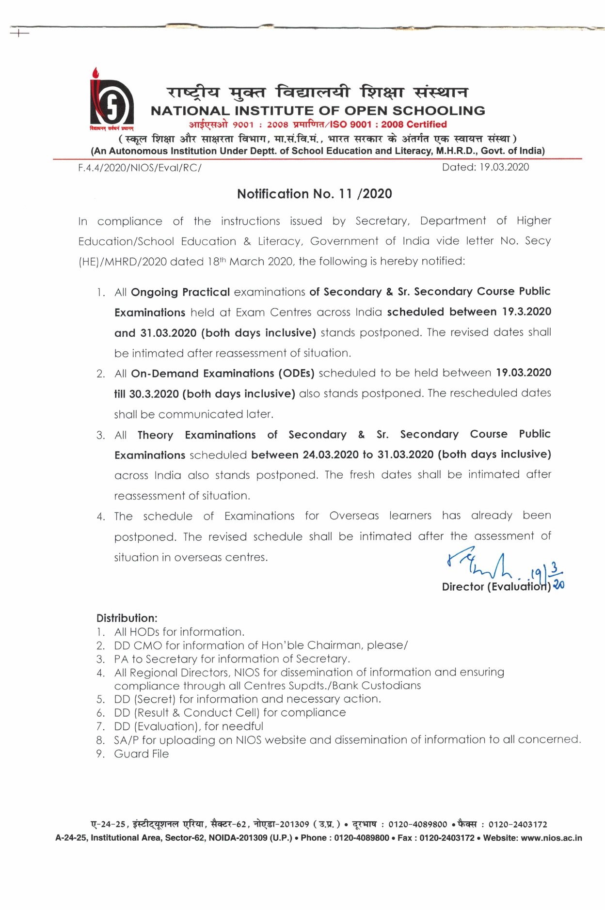 ALL Ongoing Examination Scheduled between 19.03.2020 to 31.03.2020 stands postponed